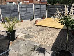 Grey Fence With Slate Chip Border Around Grass Garden Fence Paint Small Garden Landscape Painted Garden Sheds